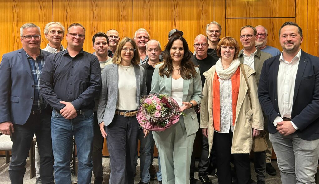 In der konstiuierenden Ratssitzung am 6. November 2025 wurde Sandra Neß (Bildmitte mit Blumen) zur 1. Stv. Bürgermeisterin gewählt. Die CDU-Fraktion hat sich nach der Sitzung zum Gruppenbild formiert (von links): Thomas Neu, Hermann-Josef Görkes, Nils Eichelberg, Sebastian Zahn, Marco Dey, Stefanie Schulten-Borin, Bernhard Boland, Pierre Gabriel, Sandra Neß, (verdeckt mit Kappe) Christoph Loskamp, Joerg Fischer, Roland Schmithuisen, Bettina Dülligen, Axel van Clewe, Marcel Majert und Fraktionsvorsitzender Marcel Opladen